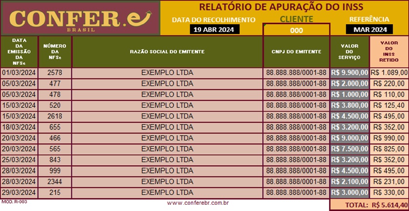 A assinatura mensal proporciona aos clientes, receberem impreterivelmente no início do mês subsequente ao mês de emissão das notas fiscais de serviço eletrônicas analisadas, relatórios mensais detalhados, específicos para cada tipo de tributo retido, onde o cliente poderá obter as informações necessárias para a correta efetivação dos respectivos recolhimentos, como por exemplo: o mês de referência do tributo a ser recolhido, a data da emissão e número de cada nota fiscal de serviço eletrônica na qual houve a retenção do respectivo tributo, a razão social e o CNPJ do respectivo emitente, o valor do total do serviço, o valor do tributo retido, e a respectiva data para o recolhimento do mesmo. No caso do ISSQN, os relatórios contendo tais informações serão emitidos específicamente para cada município onde o tributo deverá ser recolhido.
